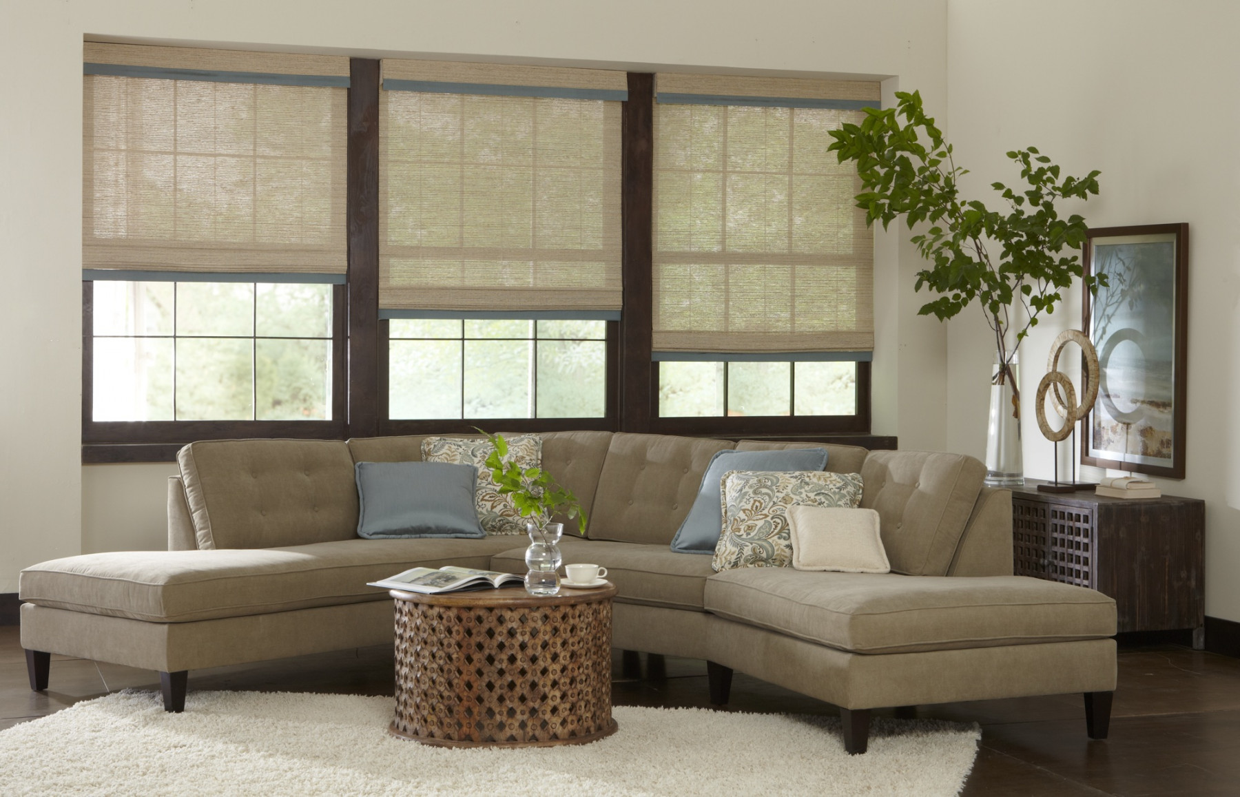 Light-filtering or room-darkening liner is attached to the back of the natural woven shade and raises/lowers in unison with the shade.