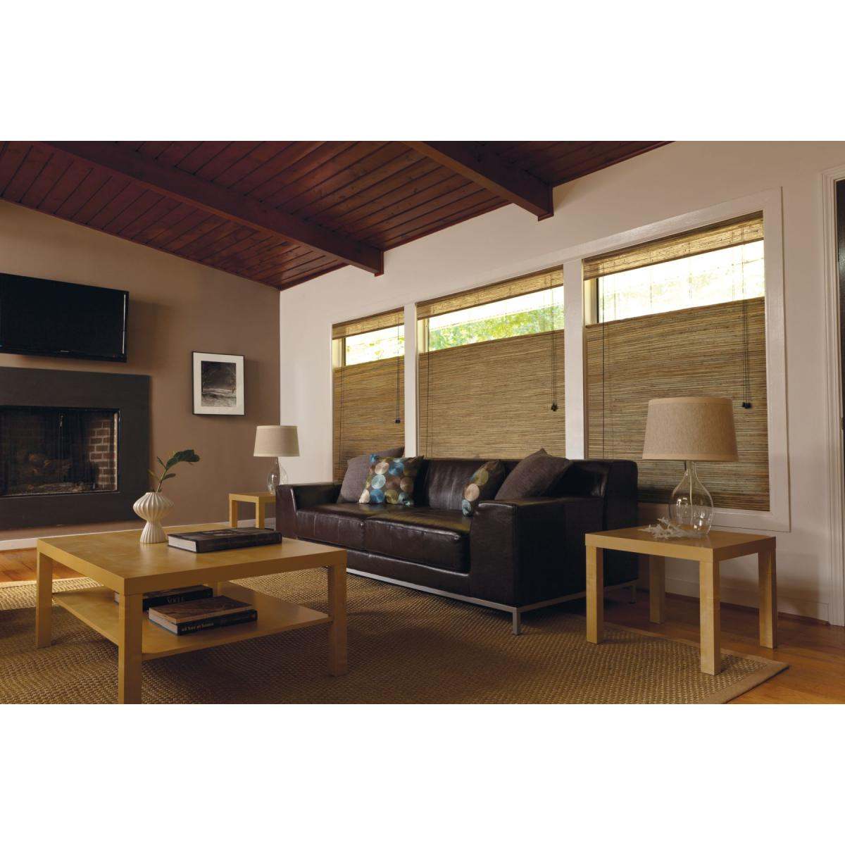 Light-filtering or room-darkening liner is attached to the back of the natural woven shade and raises/lowers in unison with the shade.
