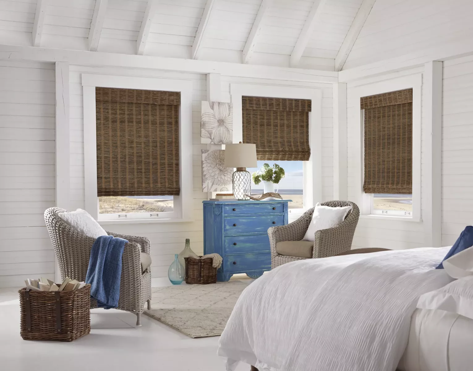 Light-filtering or room-darkening liner is attached to the back of the natural woven shade and raises/lowers in unison with the shade.